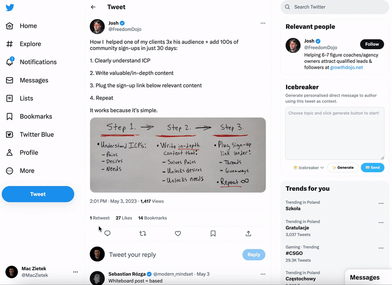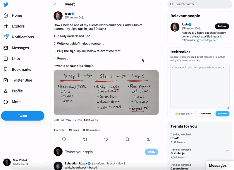 3. Icebreaker generates a DM with a smooth connection between you and post/activity.